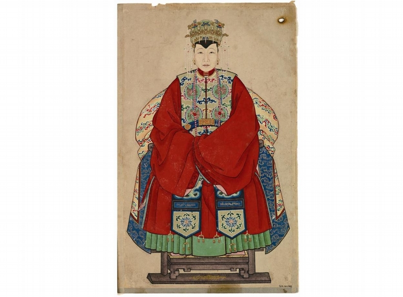 祖先像又稱祖容像,從11世紀宋代起始至20世紀初期,此類作品曾大量出現於民間家庭中,以作為崇拜先人的祭祀載體。明清時期祖先像的畫面構圖大體一致,多採取全身正面像,身著正式服裝,並端坐椅子之上。然而,其中也會出現些許變化,例如面容特徵有傳統的中國描繪線條與敷染,或施以西式的立體陰影繪法;背景陳設也會依照族裔之要求,而出現簡約或繁複的裝飾設計。由於祖先像屬於祭拜儀式之物,並非純粹美學藝術品,所以在中國傳統鑑賞界中並未受到關注。反倒是西方世界從近代以來,便以民俗人類學的眼光展開積極收藏,至今累積不少優秀作品。