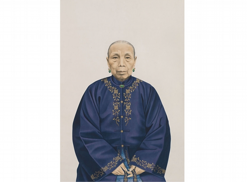本次展覽除了聚焦明清時期的各式肖像畫主題,策展團隊亦關注人物畫的製作工坊和創作技巧。例如現藏德國慕尼黑國立民族學博物館(Museum Fünf Kontinente, München)的19世紀〈百壽臉譜〉,作品包含365幅僅出現面容的小型人物像。這些像主囊括男女老幼等各個年齡層,外觀裝飾從長髮、蓄鬍到戴眼鏡與官帽者皆有,展現民間社會人物的豐富百態形象。這套冊頁明顯是當時職業畫師的臨摹手稿,也有可能提供給顧客的參考資料。而另一幅〈李夫人像(陸禧甫夫人)〉(圖15),則清楚見到畫中主人的面容畫法,是受到當時新穎的照相技術影響,具有高度寫實的驚人效果。人物上方的題跋則是講述畫主的生平行誼,以供後世子孫緬懷悼念。