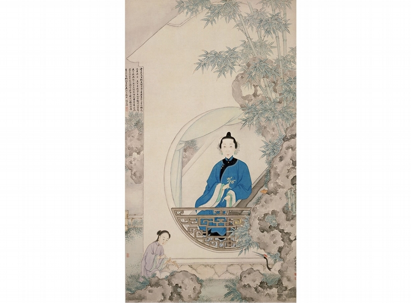 除了三代同堂的家慶圖,還有一種描繪家族生活情感題材的行樂圖作品,這次也出現在展場裡,其中可由周笠(活動於18世紀末)繪像、曹貞秀(1762年生)繪景的〈曹貞秀像〉(圖13)為代表。曹貞秀為清代官員學者兼書法家王芑孫(1755~1818)的妻子,字墨琴,自署「寫韻軒」,善於詩詞書畫。畫中主角裝扮雅緻,手持一束幽蘭,安坐庭閣當中。院外湖石聳立、青竹翠綠,還有丹頂仙鶴與手握禾穀的僕童分立兩旁,傳遞一股清新祥和的悠閒氣韻。又「竹鶴」與「祝賀」、「鶴禾」與「和合」讀音相近,遂帶有吉祥象徵寓意。這幅肖像畫的出現,意味著明清時期閨閣人物逐漸擁有獨立成像的認知意識,並非作為仕女畫而供收藏者賞玩,當是女性創作者對於自我認同的一種肯定方式。