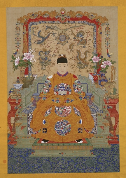 對於明清時期的統治者來說,皇室御容圖繪具有重要的歷史紀錄意義,反映當朝的政治權勢和文治武功。在正式的帝后像方面,主角通常是以正面姿態呈現,穿著豪華富麗的皇袍衣飾,正襟危坐,並描繪座位底下鋪墊的織紋地毯。這類肖像作品多存放於紫禁城內的太廟明堂中,選在特定節日時展掛,以作為祭拜或瞻仰之儀式功能。展品〈明熹宗朱由校朝服像〉(圖1)即是由宮廷畫師奉旨繪製,但因此畫乃是用於官方禮儀,為示尊重而並未署畫家名。畫中主角明代天啟皇帝(1605~1627)於15歲登基,卻於22歲時不幸因病駕崩,所以顯示的是他在世時年輕的容貌。至於在人物四周所布置物品的繽紛色彩和豐富裝飾,都具體彰顯出皇室威儀、吉祥寓意和個人修養等各項象徵意涵。