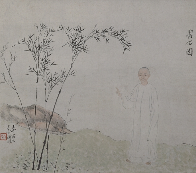 由清初肖像大家禹之鼎(1647~1716)繪製的〈納蘭性德像〉,主角納蘭性德(1655~1685)為滿族正黃旗人,康熙年間獲進士資格,授乾清門侍衛。他的文學成就以詞為最,尤以小令見長,被時人譽為「清代第一詞人」。圖中他端坐在大理石床,桌案上擺放青葉紅蓮與高古銅器,傳達出一派文人騷客氣質;畫幅旁的詩文題跋,皆是友人對他的懷思唱和之作。另一件由玉堂寫照、改琦(1774~1829)補圖的〈醫俗圖〉(圖8),則是描繪改琦身穿白衣,站立於一叢竹樹旁。右側畫題「醫俗」二字,乃是回應宋代文豪蘇軾(1036~1101)「無竹令人俗」的經典詩句。改琦自身亦擅長繪製仕女圖,其造型纖細、敷色清雅,是清代中晚期的人物畫名師,於京師和江浙一帶藝壇備受推崇。