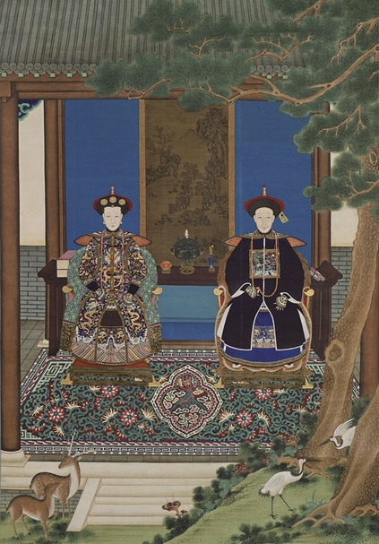 在中國傳統社會裡扮演關鍵角色的仕宦階層,至今也留下不少相關的肖像作品,其主題繁多且內容豐富。例如描繪明代官員的〈楊我行神像〉(圖3),畫中人物身穿紅色朝服並頭戴官帽,胸前縫製的華麗紋章和地面織毯的吉祥圖式,都代表主角不凡的身分地位和社會名望,是明代時期單一官員肖像的典型模式;而如此一般等身正面像的製作形式和畫幅規模,應是用於祠堂祭拜活動當中。另一件清代中晚期的〈夫婦像〉(圖4),構圖布局更加複雜:畫面中央出現的是一對官員夫婦的朝服像,而四周環境更配置松樹、仙鶴、福鹿和五彩靈芝等具有長壽寓意的動植物。背景當中的山水掛軸與清玩文房,亦突顯出主人翁的雅趣品味和審美情調。