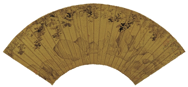 清張風1653年作〈桐蔭把卷圖〉扇面,金箋墨筆,16.5×49.5公分。