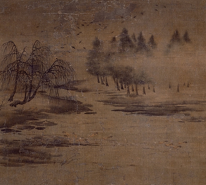 本圖(圖6)是傳稱為北宋宗室畫家趙令穰(?~1061~1100~?)的作品。畫面左側的岸邊描繪著柳樹,右側的岸邊則描繪出籠罩於霧中、向畫面深處綿延的寒林。水面上可見鴨群,天空中則有寒鴨成群飛翔。全幅以水墨為基調並同時施加色彩:天空和水面使用淡青,鴨群則著以黃色。趙令穰的作品繼承了江南山水畫那種在小畫面中充滿濃厚詩情、表現出平靜水景的傳統,甚得文人畫家們喜愛,並為文人山水畫所繼承。被視為明代吳派文人畫壇之創始者沈周(1427~1509)在其仿古圖冊〈九段錦畫冊〉(京都國立博物館藏)等作品中,便屢屢描繪出仿趙令穰之畫作。有一說認為沈周乃是由同為宗室出身之畫家,如北宋李成、元代趙孟頫等相關序列中擇取趙令穰畫風予以模仿,由此可窺見那些意識到各種風格系譜之文人畫家的仿古態度。