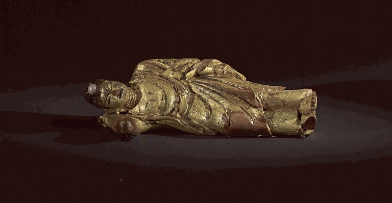 〈木貼金臥佛〉出於地宮函盒最裡層的銀函中,是地宮最核心的瘞埋之一,為釋迦牟尼佛「右脅臥獅子床」涅槃像。佛像右手枕於頭下,側身平臥,左手平撫體側,神態平和坦然,符合佛陀涅槃之圓滿相。此尊臥佛的頂髻和白毫處鑲嵌有大小珍珠,同時在銀函底部鋪有一層細小的彩石,邊上有塊狀香料,這些都是虔誠供養的表現。佛塔本是供奉佛陀舍利的紀念性墓葬建築,之後在佛教傳播之地,人們都以建立和供奉佛塔來象徵傳承教義,而在地宮中供奉舍利和寶物的同時供奉釋迦牟尼佛涅槃像,應該是一種宗教儀軌的完善表現,更好地執行了地宮瘞埋制度。