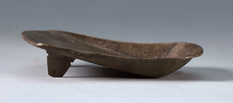 此硯出土於地宮底部。箕形硯又稱風字硯,形如簸箕,盛唐時出現並流行,宋、遼、金一直沿用。此箕形硯首著地,首尾圓弧,硯首窄而硯尾寬,兩側邊內收,硯堂呈坡狀,尾端有二長方形足。考古出土的箕形硯多為陶、石質地,此硯為青銅,較為少見。此硯線條流暢,比例協調,造型小巧,應為婦女點妝之用。