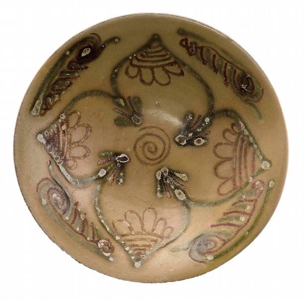 此碗為敞口,圓唇,弧腹,圈足。碗身施青黃釉,有細微的開片,露胎。碗內施褐彩和綠彩,構成花卉圖案。其中褐彩為氧化鐵彩,綠彩的呈色劑是氧化銅。這種構圖具有鮮明的域外色彩,在長沙窯窯址及揚州有少量出土,但海外發現較多。1998年在印尼海域打撈的「黑石號」沉船發現的長沙窯瓷器中,有不少類似紋飾的碗。