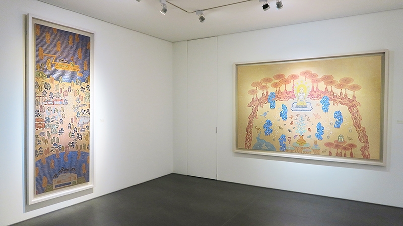 「桃源異景─潘信華個展」展場一景,左:《藍水溪畔》、右:《賞花圖2》。攝影:楊椀茹