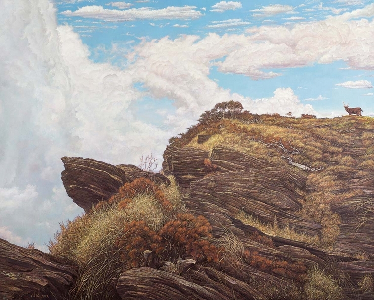 他說其繪畫就是從對於土地的感動出發,如此單純的理由,他將這些山景往心裡走、往深處走,踏實的以寫實技法累積出厚實的靈氣。他的山景雖多數由攝影文本參照建構,但特別強調畫面構圖細節的合理性,如霧氣、植被、建築物、動物都會考量在海拔幾千公尺的環境下出現是否合理。他堅信古典美學與寫實技法強大能予觀者直接溝通的語彙魅力,「寫實每個人都看得懂,要畫得好反而是最難的。」他也認為風景的難度在於氣韻生動,與屬於山林無形的感官經驗最難以揣摩。