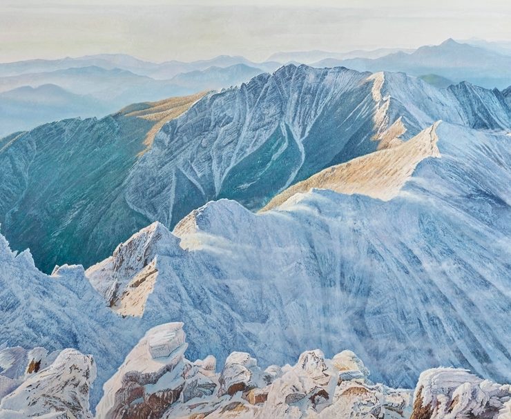 觀看劉得浪的山景,能濃烈感受到對於山巒的傾心與深情,資深山友的他細數作品中雪山、玉山、奇萊山、嘉明湖等台灣著名山景與稜線,「爬山是非常舒服的,當你走在稜線,那個視野、感官與平地完全不同,氣勢很大,你只要登上去馬上就會被感動。」此次於尊彩藝術中心的個展「行山四季」,他謙稱自己並非善言與構築論述的藝術家,但其純粹的專研古典風景技法,信仰視覺藝術直觀的語彙,在畫面中能閱讀到藝術家對於山林與寫實技法的崇敬與誠懇,「我的畫就是我的話」,比起空洞玄虛的宣傳方式,劉得浪即是以登山的步行感與踏實,引領觀者環視屬於台灣這座島嶼、山巒的明媚風華。