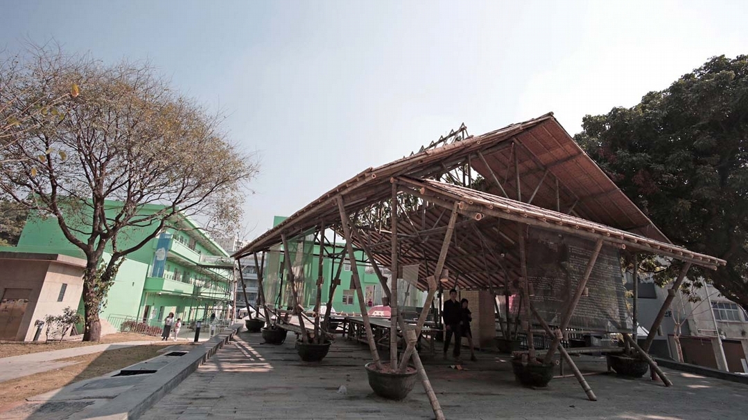 徐坦的作品《村雨計畫》以木、竹、藤條搭建成一個戶外篷子空間,作為提供討論、放映活動的空間,並邀請由一群藝術家在廣州西三村成立的「西三電影製片廠」、上陽台(廣州)、觀瀾鼇湖老村(深圳)等團體共同參與。圖│深港城市\建築雙城雙年展