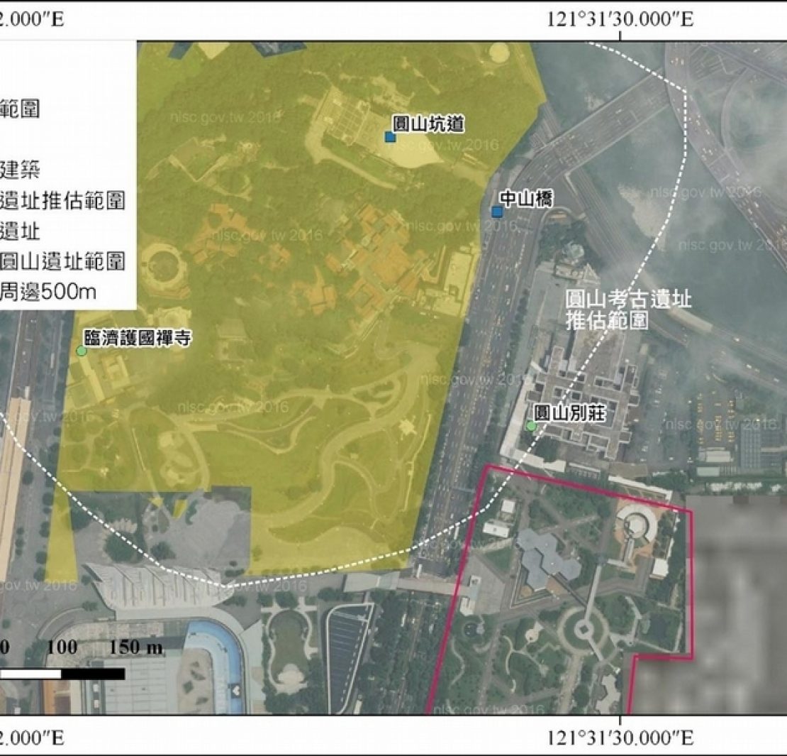 《107年國定圓山遺址監管保護計畫》圓山遺址劃定範圍。(台北市文化局、台北市立美術館提供)