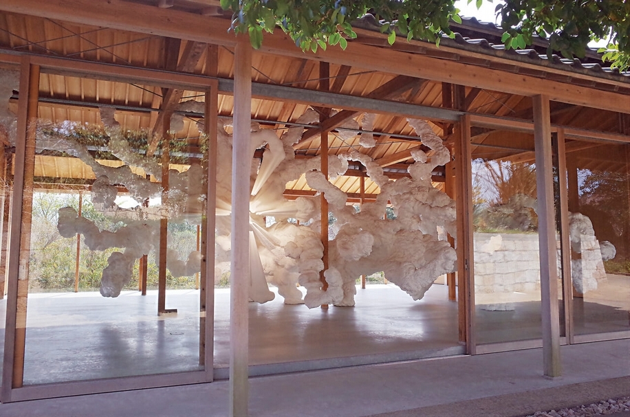 位於犬島「家計畫」的作品,則呈現出與直島截然不同的內涵。五棟由妹島和世(Kazuyo Sejima)所打造的展演藝廊與休憩處分布在村莊中,裡頭大多為年輕藝術家的創作,作品著重以不同方式或形式與在地居民產生連結,如名和晃平(Kohei Nawa)的《Biota(Fauna / Flora)》(2013)拆除相鄰神社的民宅,利用可用材料改建,其中Fauna(動物區)在三年期間持續發展,長期地展現新生命的變遷。下平千夏(Chinatsu Shimodaira)的《Ether》(2016)則邀請居住於島上的居民一起編織水線(建築工程時標示水平線的線繩),再裝置成可供居民休憩的軟空間。荒神明香(Haruka Kojin)的《Reflectwo》和《Contact Lens》打造兩座透明壓克力的圓形空間,在其中分別裝置色彩鮮豔的人工花瓣,以及由大小及焦點不同的圓形鏡片所構成的作品,兩件作品所創造的風景延續了周遭民宅與村落風景。