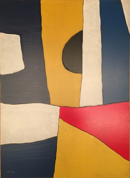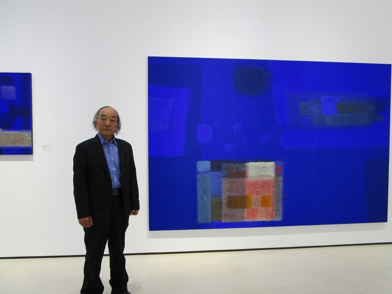 猪熊克芳則說:「我認為藍色、黑色和白色最能賦予深沉的空間感。然而,我還是最鍾愛藍色,也許是因為你真的能感受到那藍色所延伸出去的空間。」1951年出生於日本福島縣的他,從1990年代開始發展「藍之中系列」,他將群青色(Ultramarine)層疊覆滿木板,像是將深藍海水或無垠夜空引注到畫中。為增加畫面的空間層次,他會先以粉紅色打底再重覆塗抹藍色,並在顏料中加入咖啡粉,產生礦物細末折射光影之美。此次也展出「紙上粉彩系列」,其與「藍之中」相同之處,在於皆以砂紙磨損材質表面,而畫面疊加的幾何色塊,像夢境般朦朧柔和,這種消融邊界的空間感,即是他想透過色彩表現的「人心的深邃」。「Ultramarine」原意為「越過海洋」,在古典時期,此種提煉自青金石的璀璨深藍顏料珍貴非凡,特別用於描繪宗教聖像,如今不再那麼珍稀昂貴,但猪熊克芳仍能以群青色畫出滌淨人心的氛圍,以及對於遼闊與自由的追尋。