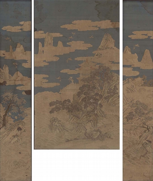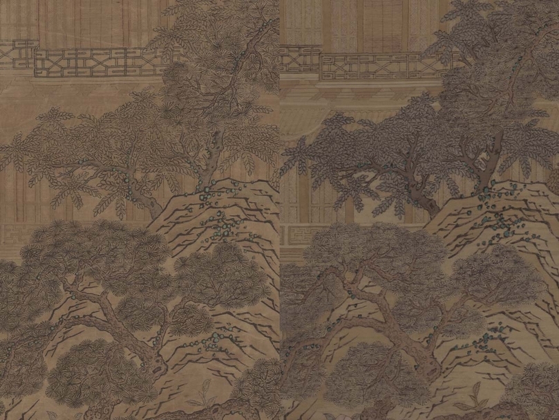 由於此件文物是緙繪結合,在仿製緙織部分的基礎上還要加入繪畫。緙絲加繪,是清代宮廷緙絲藝術較為典型的特點之一,把緙絲含蓄的高貴和書畫雅逸的精緻完美結合,多以平面展示為主,側重於體現平面裝飾功能。此件屏風繪畫描摹部分由摹畫工作室的人員進行,主要分為材料加工與繪製試驗,繪製和調整三部分完成(圖16)。一是材料加工與繪製試驗。因在日常工作中鮮見於緙絲繪畫類型文物的複製案例,所以對於繪畫技法和材料的可操作性是無法正常預期的,需要在複製前期對於材料和技法進行嘗試性實踐。緙絲不同於紙張,其質地較為柔軟,絲線也遠粗於紙纖維,加之經緯交織,表面凹凸不平,這給繪製工作帶來了很大的障礙。為解決硬化的目的,採用了托禙紙(裝裱技藝的環節)的方法。凹凸不平的問題,則通過對原件的研究及砑畫工藝(裝裱技藝的環節)的借鑑,採用輕砑的方法,即在不破壞絲線纖維結構的基礎上採取砑石輕砑,縮小凹凸平面差,使之更近似於紙絹的平面效果。根據絹本的繪製經驗,真絲往往帶有油狀分泌物,此類分泌物會影響上墨的效果,所以繪製之前刷一遍清水,已達到「洗油」的目的。解決諸問題後,即用小樣嘗試繪製局部細節,體會與絹本和紙本繪畫的諸多不同,不斷總結和記錄繪製的新方法。二是繪製。繪製是緙絲繪畫複製工作最關鍵的部分,此件文物的繪畫部分採用勾勒並淺染的傳統技法繪製而成,複製效果則遵循「製新如舊」的原則。所以用墨部分均採用墨中加舊色(赭石等)的方法,以降低墨色的「黑度」。針對緙絲材料無法拷貝線稿等特殊性,採用了更具難度的對臨的複製方法。其表面的凹凸感,致使勾線的過程無法一次性完成,遂多用複勾的方法,以達到原件線條飽滿的藝術效果。染,是傳統繪畫中重要的繪畫方法,多用於部分局部繪畫的統一性的處理,原件緙絲繪畫的局部色塊,因歲月及環境的影響所產生顏色的微妙變化,可能是緙絲工藝複製過程中不能完全把握到位的,所以在這裡便通過染的技法微調。繪製過程基本採用勾、皴、點、染相結合的技法,具體則根據材料的特殊性採用不同的方法。三是調整。調整是將整體畫面輕刷一遍清水,一則幫助顏色和墨的顆粒進透絲線纖維,使材料之間能夠達到深度的結合,提高畫面的穩定性;二則達到溫潤的畫面效果,使畫面的效果更趨於和諧統一的飽和狀態;三則趁濕更易於局部及整體的調整,調整工作反覆更換視角,爭取解決更多材料加工與繪製試驗的問題,使之更具有原件的風采。