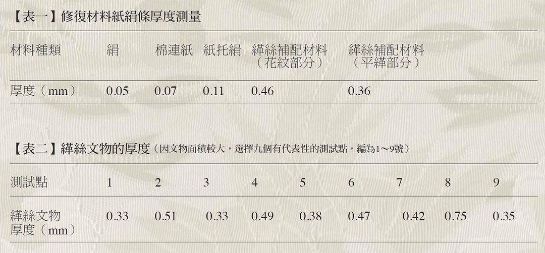 根據各種補配材料的厚度測量結果(【表一】、【表二】),最終選用帶襯紙的絲絹材質作為文物的補紙,最為接近文物本身的厚度。
