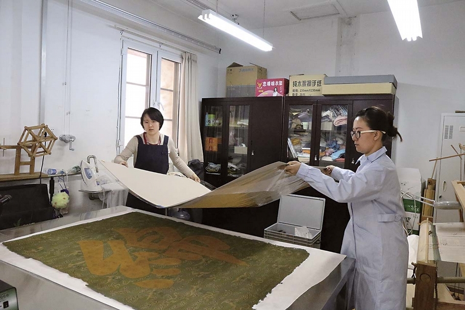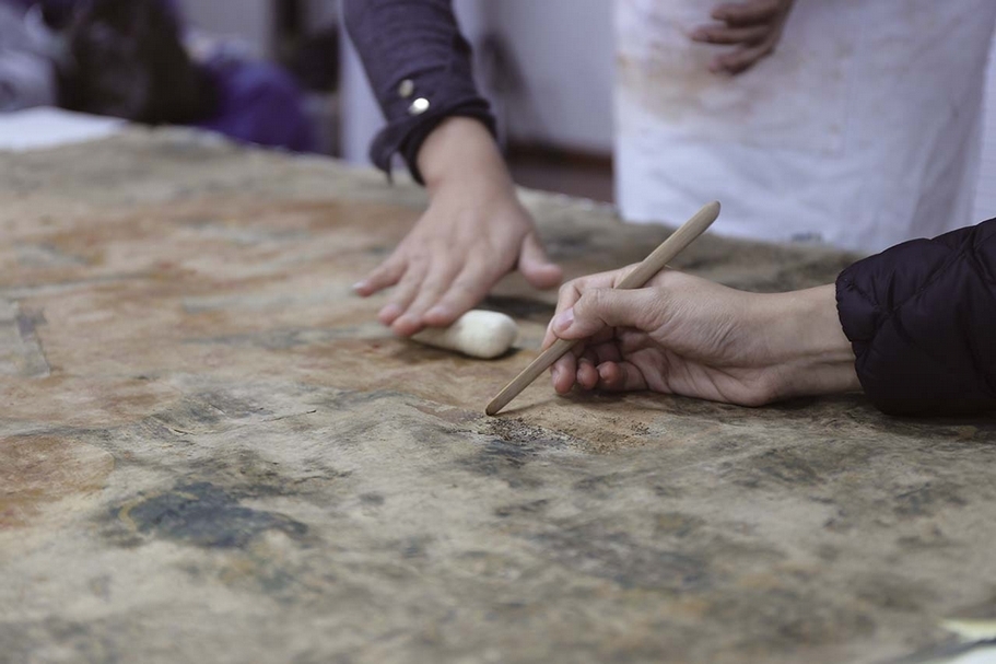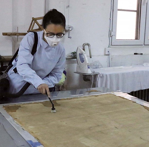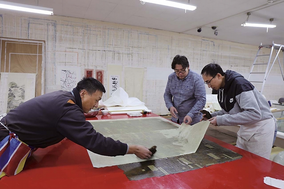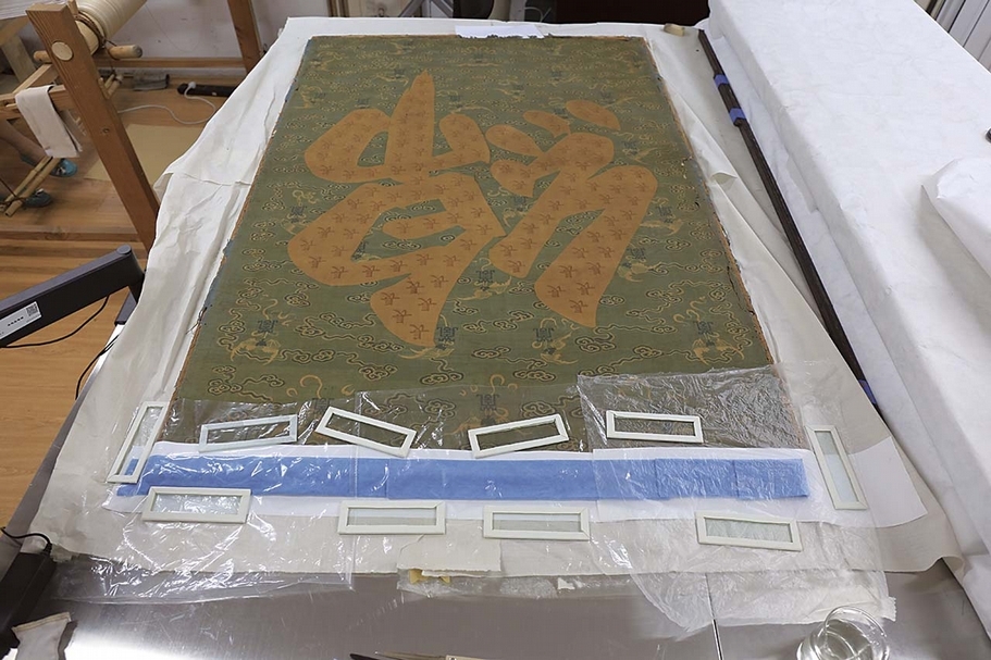 圖14-2 〈「綿」字掛屏〉保護修復過程:對文物分段回潮。圖∣史寧昌、陳楊、巨建偉、李鹿