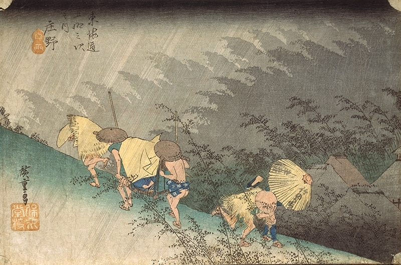 歌川廣重(Utagawa Hiroshige),〈東海道五十三驛站 庄野 白雨〉。天保4- 5年(1833-34),木版多色刷,橫大判錦繪。22.6× 34.4cm。東京富士美術館館藏。