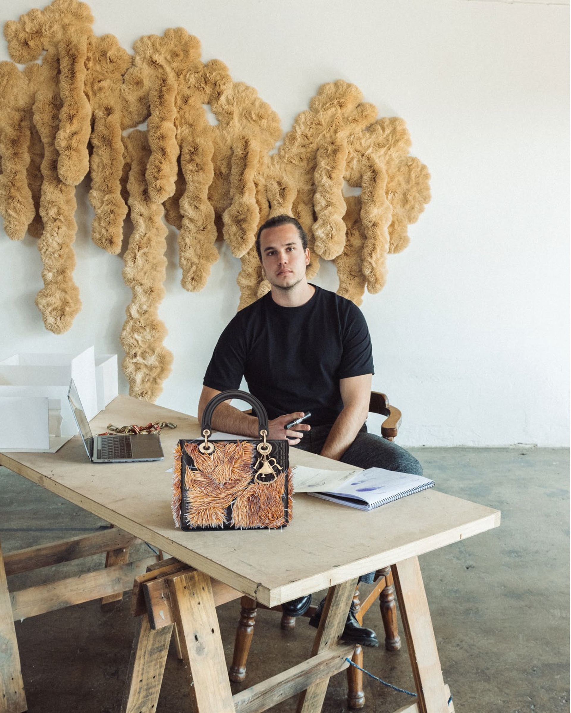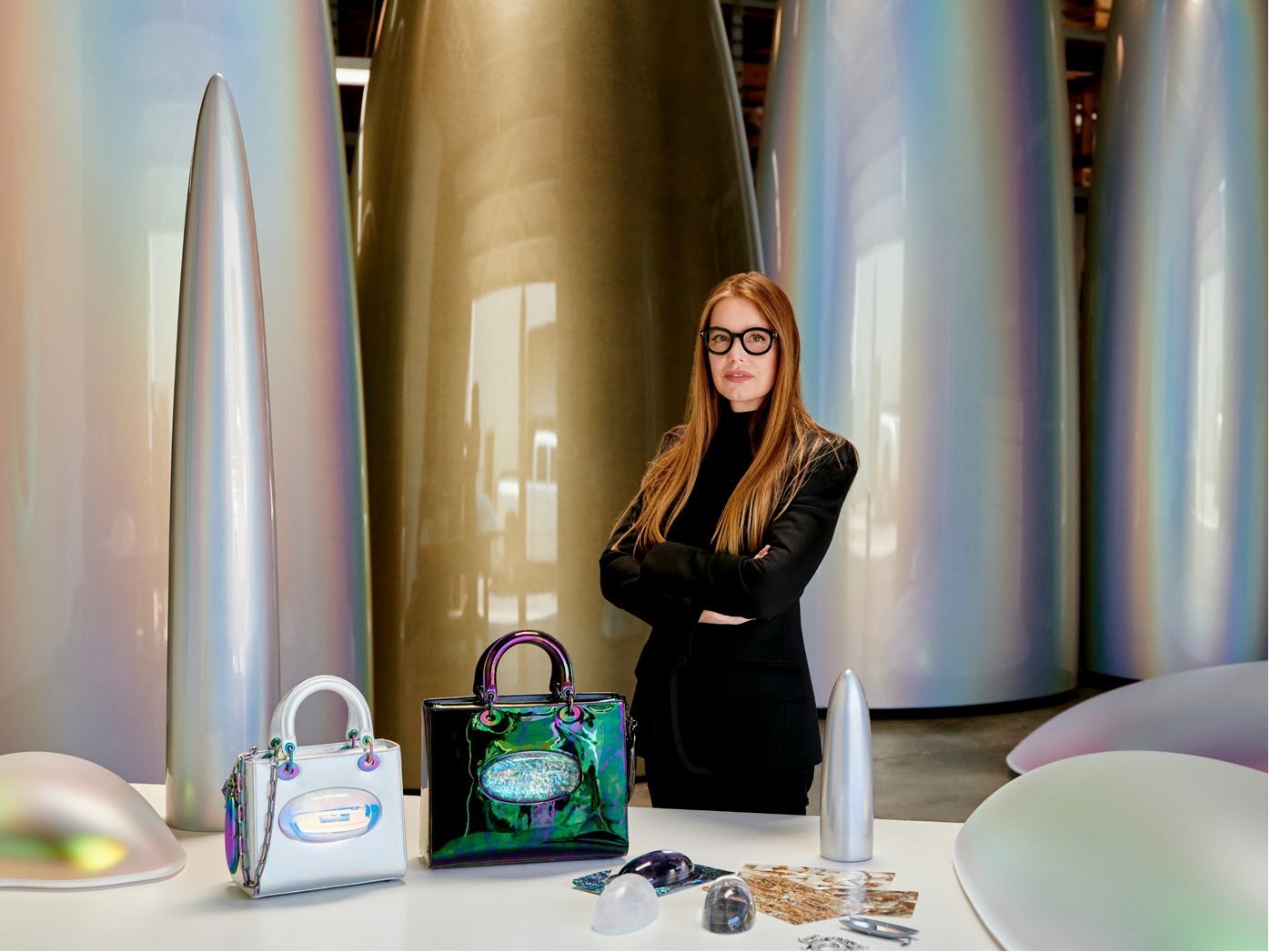 Gisela Colón的作品則充滿未來感,中央鑲嵌蛋白石效果的綠色橢圓形為視覺焦點,包款側邊附上的梭形鏡子對比之下有手做的純樸溫潤,她將心中的未來包款分別命名為「星塵」(Stardust)與「亞馬遜」(Amazonia)。佩雷特將自身著迷的虛構語言,結合楔形文字、繪畫及蒙德里安的幾何美學,以掛毯圖紋方式化身成Lady Dior。藝術團體回收小組則是用波浪和漩渦效果解構、重塑經典籐格紋圖案,探索「虛擬永生」的概念;藝術家Chris Soal將印有佩雷特Dior字樣的瓶蓋對折、滿滿地覆蓋在包身表面,宛如斑斕貝類,或用手工上色的牙籤形成立體刺繡效果。