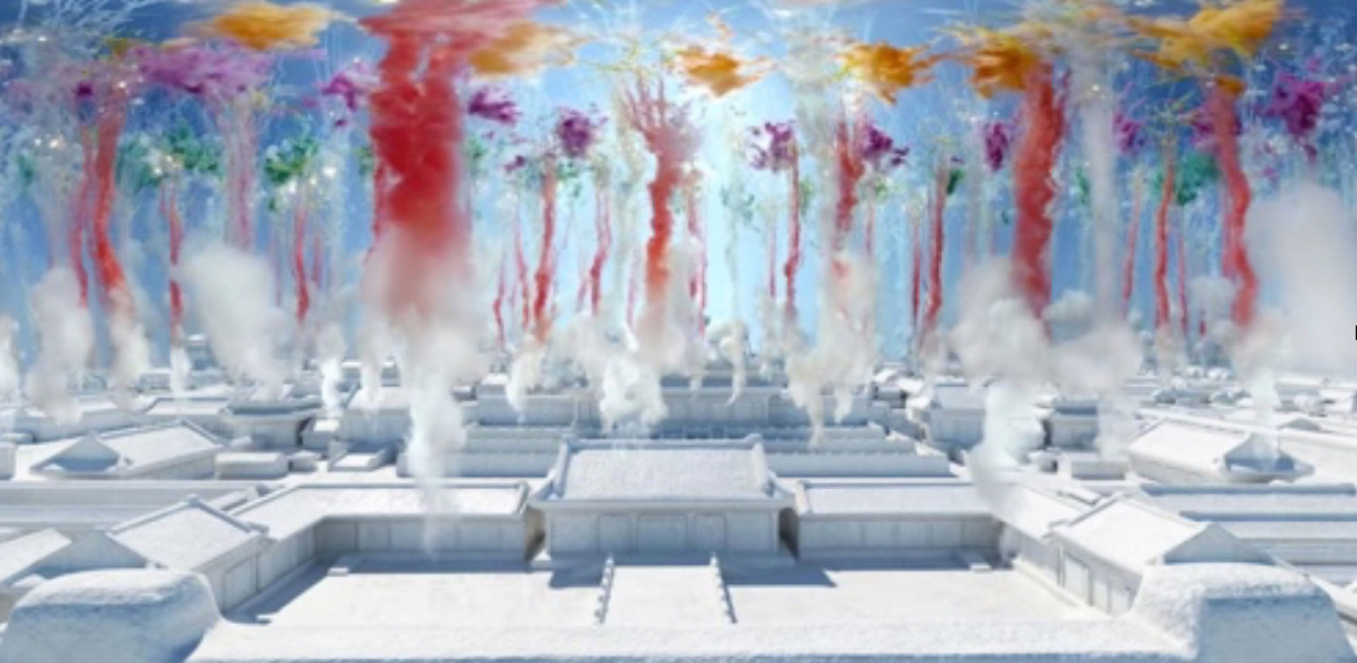由於故宮的古蹟身分,無法實地進行爆破活動,採用VR技術可說是一種折衷方案,虛擬的煙火在白玉紫禁城模型中爆發,白色的建築體強調出獨具蔡國強特色的彩色煙霧。蔡國強表示該作品受到天圓地方、五行原則所啟發,並彰顯了中華美學及坐擁天下的氣魄。整部VR煙火作品時間大約5分鐘。