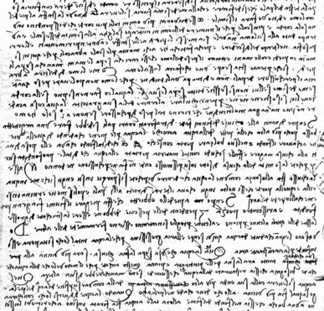 很明顯地,達文西的筆記只供他自己參考,結構散亂,字體潦草,多數也沒有標點符號。有些筆跡非常紊亂,像是為跟上靈光乍現的那一刻。