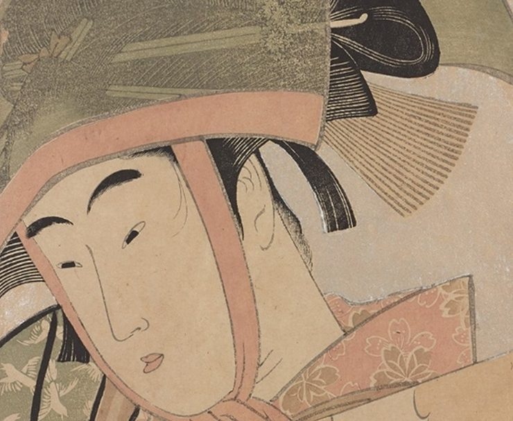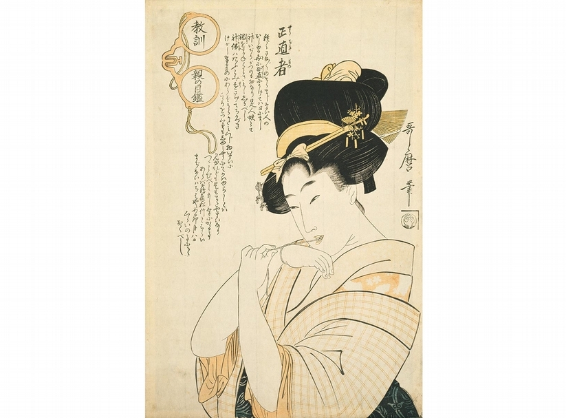 喜多川歌麿為江戶時代浮世繪畫師,活躍於安永年間(1772−1781)至文化3 年(1806),據說其師從狩野派庶民畫師鳥山石燕。喜多川歌麿受到出版商蔦屋重三郎賞識,其擅長描繪附帶插畫的狂歌本及美女圖,風格大獲好評,特別是僅描繪上半身、以臉部和胸部為主的「大首繪」美女圖,出色呈現出女性流露於表情與舉止的內心世界。
