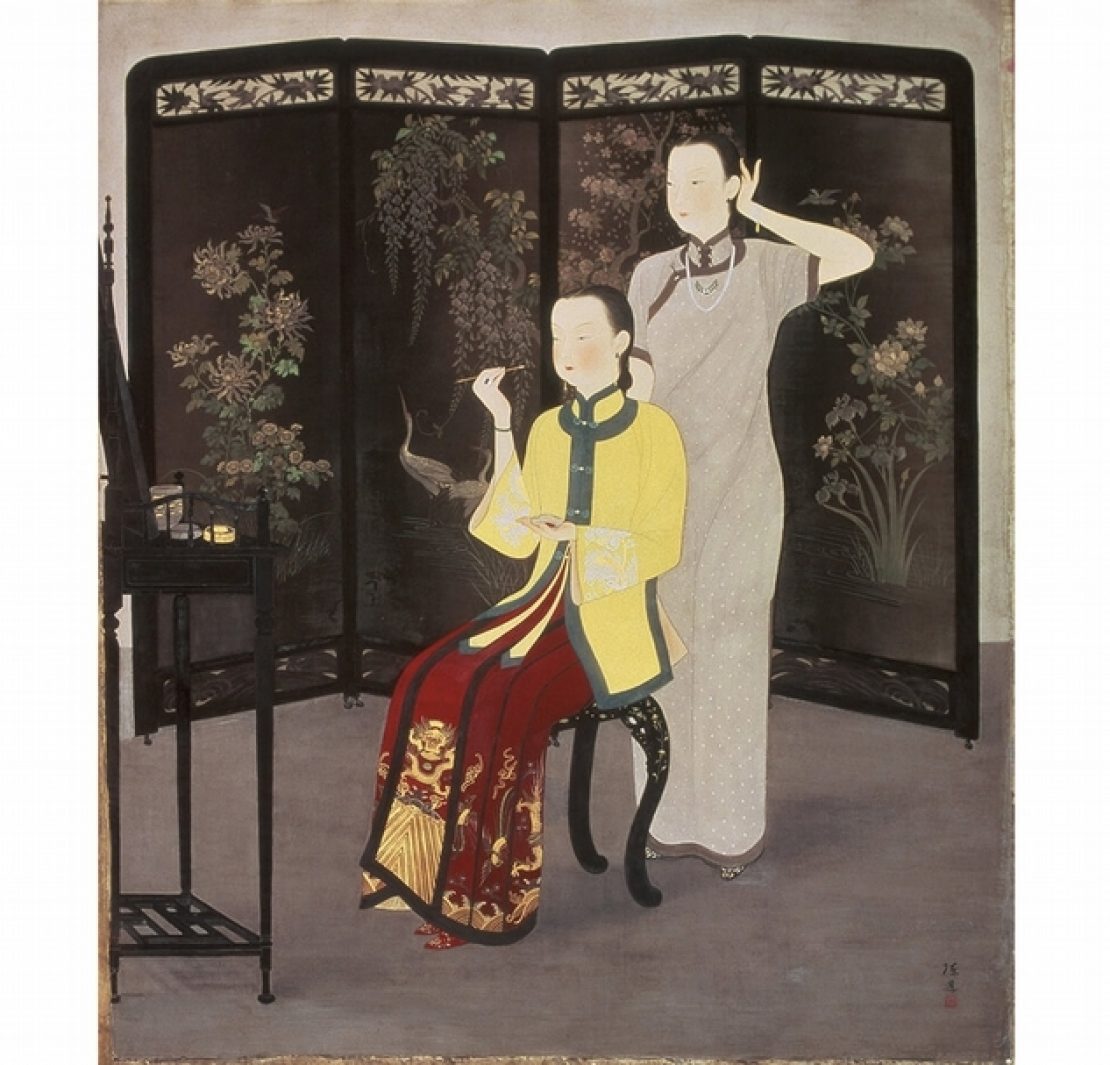 陳進1936年作〈化妝〉,膠彩絹本,212×182公分。同年入選日本春季帝展。