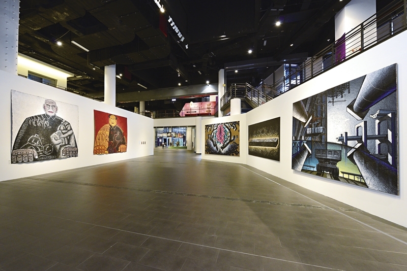 美術街展區,左為吳天章《關於蔣介石的統治》、《關於毛澤東的統治》,右為陸先銘《對她的仰望》、楊仁明《思考中的知識份子》、郭維國《新樂園》。(圖/國立台灣美術館)