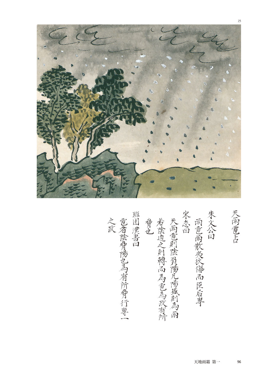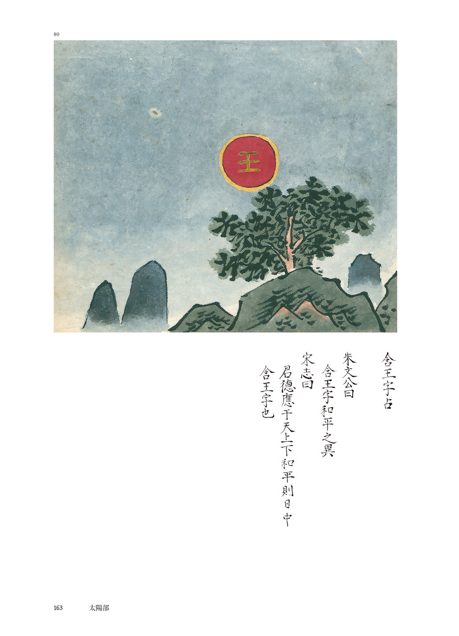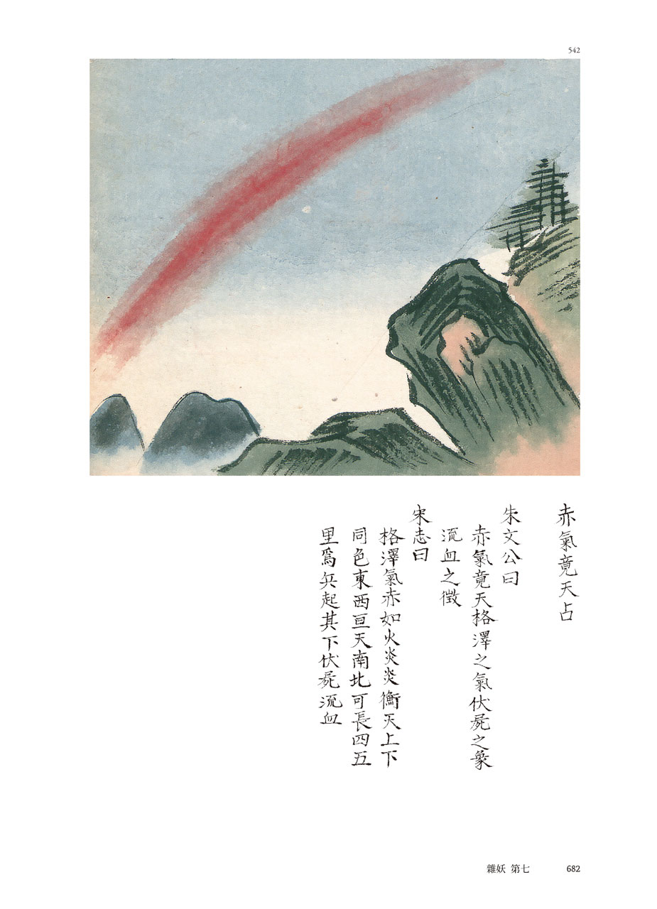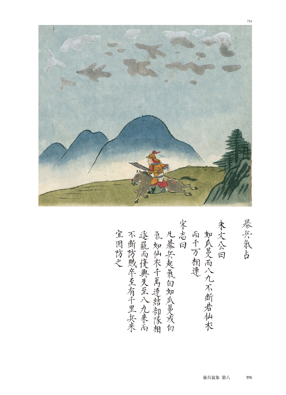 占星術既是「以圖識象」,這種觀測術起源甚早,可以上溯《周禮》的十煇,從氣象學可以論證十種天象。(註2)在新編本中以日暈為例,《宋志》的記事極為簡短,日暈再重象「歲豐」、三重象「兵起」,僅用二字。彩繪本則著重在圖,每種暈各繪一圖,「日暈兩重占」繪出再重,直到十重,總共九圖而篇幅大備。上欄繪圖,下欄史志,比較《宋志》的文字小異而旨意則同。再重占僅說「人君有德」,三重則增加數字,占為「穀傷,赤雲貫之,其下有失地」。「朱文公曰」則但取「野有兵戎」之驗,可知天文官在取捨之間仍有所選擇。