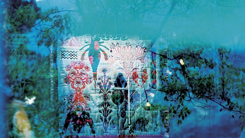 從市區搭乘的巴士翻入外雙溪半山腰,漫開的是不知名蟲鳴的微弱噪動,混著泥土與樹葉以及些許潮濕腐敗的草腥味,撥開樹影圍繞的山徑,是一處被溫室黑網覆蓋的建築。在樹的枝與根盤旋間懸掛的是古斯塔「半夢半醒Hypnopompic」系列,他訪探自身與他人的夢境甚至是幻視的經驗,以法國查卡(Jacquard)緹花織機技法,利用嫘縈、金屬線、羊駝毛、毛海等差異織料,將夢境與幻覺這些假性存在的視覺,鉤築成有著繁複幾何、有機生物形體、色彩斑斕絢麗的大型掛毯;織料使得圖像如同浮出、攀附在布料上的生物,如同視覺可以觸摸般,躊躇遊走在意識與非意識的邊陲。
