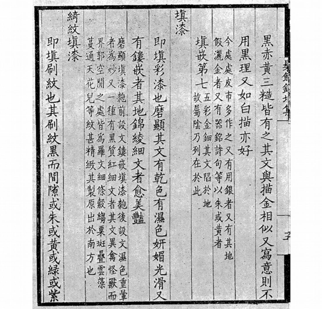 中國歷史上對於漆器製作的專著,雖可上追五代朱遵度(925~1007)所編著的《漆經》,惜原文早已佚失,僅留書名錄於《宋史.藝文志》,今人無法窺其全貌。文人筆記或多或少存有漆器工藝技術的記錄,如元人陶宗儀(1329~1410?)《輟耕錄》中的「髹漆」條,描述了製漆方法與工序;或品評漆器的記述如明曹昭《格古要論》(成書於明洪武二十年,1386)一書中的「古漆器論」,強調以漆色、漆質、刀工及堅實與否作為評斷漆器好壞的標準。但這些記錄在規模與完整度上,自然難及髹漆的專門著作。因此,《髹飾錄》不僅是現存中文文獻中最早、也是唯一傳世講述漆工技藝的專書,對於了解中國古代、甚至東亞漆器的製作工序、技法,乃至對於今日博物館為漆藝品項之定名與分類都有極大的參考價值。