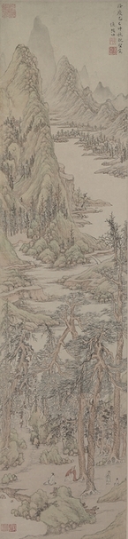 侯懋功是吳派大師文徵明的弟子,此畫以小青綠為之,加以淺淡的乾筆皴擦,展現清新雅致的文人品味。文人坐於山林中,享受回歸自我的片刻,是隱逸山水常見的主題之一。暫時的避世,到山林裡放空、沉思,找回能量後再回到日常生活的繁瑣之中,古人也懂得紓壓之道。