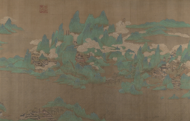早期道教思想中,仙人居住在山中的仙境裡,然而,要進入仙人的國度,必須透過一個特定的洞穴入口,稱為「洞天」。因此,山水畫經常被用來表現仙境,藉由畫家的想像,營造出一個非人間的山水林泉之境。其中,青綠山水豔麗飽滿的色調,經常被用來表現仙境的唯美景致。目前於美國紐約大都會藝術博物館舉辦的「溪山無盡—中國山水畫傳統」特展中的〈海天旭日圖〉卷(圖1),即展現了漂浮於海面上的華麗仙境,數座島嶼上綿延著重重青綠山脈,白色卷雲繚繞其中,一隻小龍正飛躍雲端;山谷中座落著城牆、樓閣、房舍、佛塔、寺觀、小橋,還有水車、田畦,然而畫中人煙稀少,點景人物極小,展現清冷靜謐的奇異氛圍。