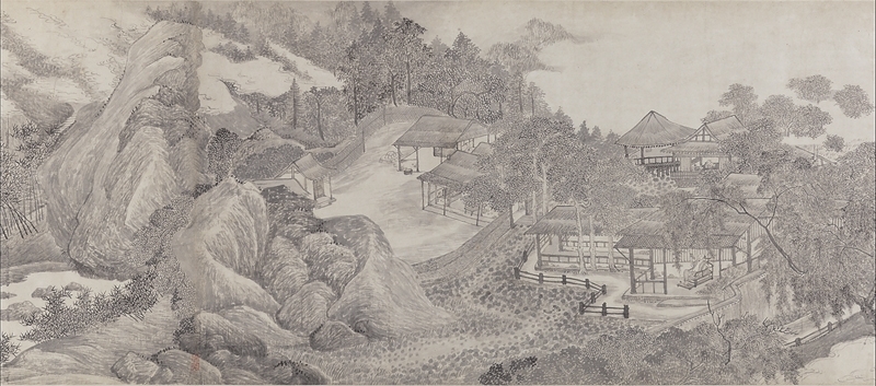 此圖純以濕筆水墨畫成,表現梅雨過後剛剛放晴的溼潤感,卷首為一段江面水域,遠處岸上一大片農田,近岸小橋通往草堂,顯示草堂並非位於偏遠的深山之中,而是建在農村附近的山丘上。橋下有一人攜漁簍於溪邊獨自垂釣,走過小橋,沿著小路繞過矮牆,路徑消失在樹叢中,觀者雖可望見整座書屋,卻找不到通往入口的小路,增添了山中草堂的隱密感。草堂建築樣式簡單,內有一人敞開上衣,閒適地坐在椅子上閱讀,後方屋裡則堆放著書卷。建於山林之間的書屋不需過多的庭園布置,簡單的矮籬,欄杆外一池蓮塘,院落及附近雖有人工栽植的樹木,看起來卻與山林融為一體,放眼望去盡是青山綠樹白雲,大自然便是最好的庭園之景。