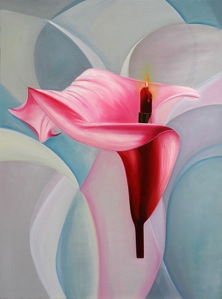 以今喚古,時空同時存在的意象,達到穿越古今的趣味性。並在具象描繪局部花卉裡,尋求其畫面的抽象意涵及線條之美。