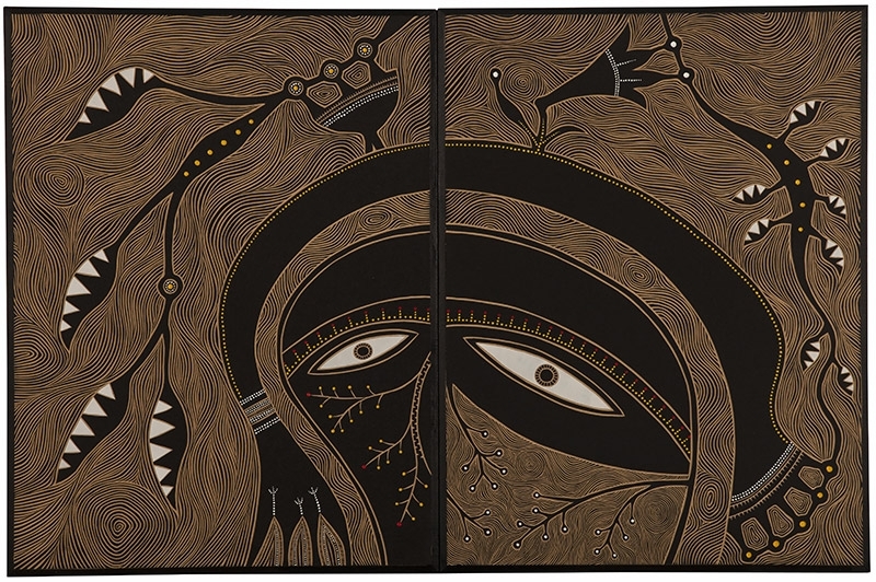 伊誕‧巴瓦瓦隆 〈我的羽毛〉 紋砌刻畫(木板、版畫顏料、壓克力顏料) 雙聯幅(80x120x5cm) 2016