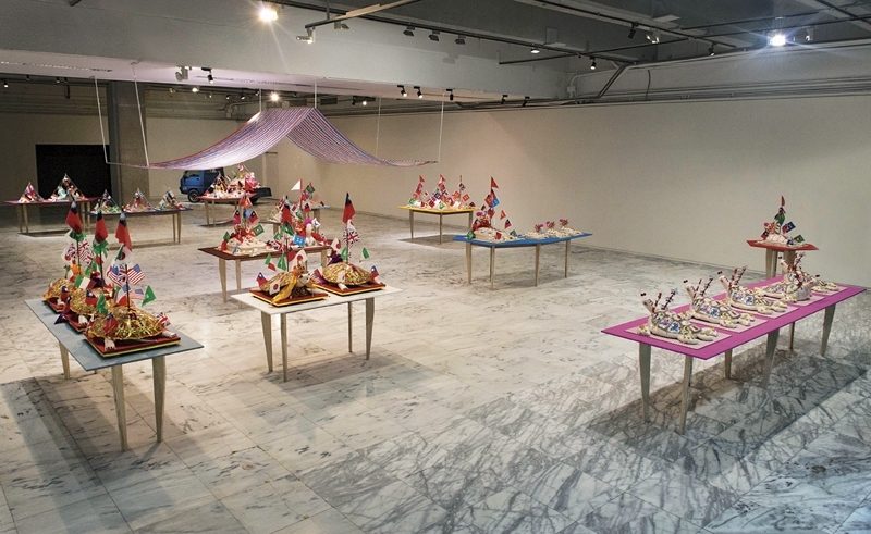 在台北市立美術館相對另一側的會議廳裡正進行著由「檔案轉向」來探討東亞當代藝術歷史書寫的研討會,而此白空間展廳中則陳列著各樣式的「平安龜」,一種流傳於閩南沿海、澎湖及其移民區域民俗祈福用的供品;從米糕、肪片、麵線等材料運用變化,嵌配著不同時期起採用的傳統紙花、旗幟或電子燈飾,都做為不同時代之精神與物資聚集狀態的物證。