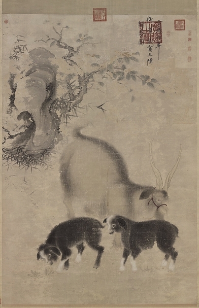 這幅〈畫三陽開泰〉(圖3)是宣宗31歲年輕時的作品,畫上有「宣德四年(1429),御筆戲寫三陽開泰圖」的署款,並鈐蓋「廣運之寶」御用璽印。畫面採三角形構圖,將一隻母羊與兩隻乳羊依偎相伴的情景放置於畫面正中心,並以竹樹與茶花搭配為襯景。整幅畫以水墨為主,用筆層層皴染,略加淡彩,風格典雅自然,帶有文人畫筆墨的韻味,不禁讓人想起宣宗最景仰及學習的對象──趙孟頫之〈二羊圖〉。另外,從吉祥寓意的功能來看,「羊」與「陽」諧音,「竹」與「祝」諧音,所以這張畫具有祝賀「三陽開泰」之意。「三陽開泰」最早源自《易經》,古代人經常用它來傳達新年歲初時迎春送冬、陰消陽長的祝福。再者,農曆十一月為「一陽生」,農曆十二月為「二陽生」,以此類推,古畫上許多與羊(陽)相關的題材,都與此農曆節日的吉祥寓意有關。