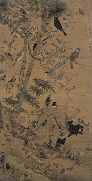 數一數有幾隻鳥邊文進〈三友百禽軸〉邊文進(約1356~約1428),字景昭,福建沙縣人,為明初宮廷最重要的花鳥畫家。他在明成祖永樂年間便被召入畫院,授武英殿待詔,直到宣德年間仍供奉內廷;其畫風承襲北宋黃筌花鳥畫派精緻濃豔的傳統,在明初宮廷具有相當之影響力。