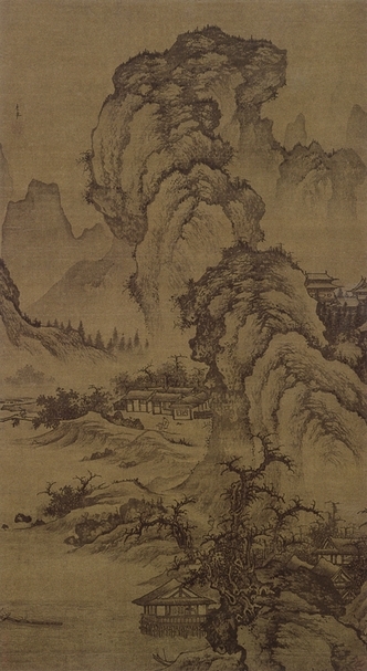 本幅〈闊渚遙峰〉(圖6)將行旅與田園村居生活結合於一幅畫中,只見山下數間茅屋門前,有二人交談,一童子持琴相隨;近處喬柯下,駛過一舟,一人坐在船頭吹笛,二人在旁飲酒取樂,生活氣息濃厚。畫面左上方有畫家款署「李在」,並鈐蓋朱文「金門畫史之印」。李在的畫風受到北宋郭熙之影響極深,本幅即為一例,如構圖學自郭熙〈早春圖〉,以中央主峰主軸,堆疊出帶有「S」形動態的走勢,山頭布滿濃密的苔點,山石的質理則採用細密流利、舒卷如雲的線條──稱之為「雲頭皴」──來勾勒山石的輪廓,再層疊反覆皴擦;至於樹木與枝葉部分,乃以弧曲伸張、如螃蟹腳爪造型的「蟹爪枝」予以表現。李在的筆墨相較於郭熙,更為自由放逸,這是明初院體或浙派畫家學習郭熙風格的特徵之一。
