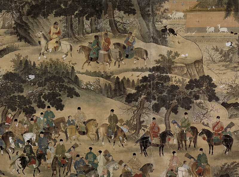 〈朱瞻基明宣宗行樂圖〉(圖4),縱211公分、橫353公分,是明代帝王行樂圖中最著名且年代最早的一幅。畫面描繪的是明宣宗春日郊遊行獵的場面:其中,見畫面左上角平坡上,一位容貌豐肥,體格魁梧,頭戴源自元人的尖頂「笠子帽」,身著紅色窄袖衣、外罩緊身黃袍服的騎者,即為明宣宗;在他身後,有三名各自捧抱樂器、背著弓矢、手擎寶劍的侍從隨行在後。山坡松林間,還有20多名隨侍乘騎列隊,經過石橋邊,沿山坡迂迴前進。整幅畫的背景,為松林環抱、桃杏盛開的郊野,山坡左右各有石橋一座,山前山後也有鶴、鹿、獐、兔、雉雞、孔雀、喜鵲、鴛鴦等山禽水鳥嬉遊其中,彷彿別有洞天之仙境。據學者考證畫中苑囿景致等特徵,可推測本幅畫所表現的自然環境,應當就是京城南苑的「南海子」,即元明清三代以來專供皇室射獵講武之所在。此件作品再現了當時帝王宮廷生活的一個側面,加之紀實描繪了人物形象、服飾器物、及環境周遭,堪為後世保留了非常珍貴的歷史資料。