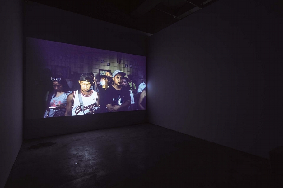 與此前「逝去中的風景」系列或是《在記憶之前》有著明顯差異的是,此次的三件影像新作都以單頻道呈現,很大程度上是在個展整體面貌的考量下,一種去繁求簡、刻意為之的美學策略。《日常演習》又與以往的軌道移動拍攝不同,藉由直線運動的空拍機,創造出類似掃描、甚至帶有審查意味的畫面運動。而《異鄉人》則是袁廣鳴第一次使用平移的運動方式,借力的是火車進站時的行進軌跡,憑藉每秒1200格的高速攝影機和一束手電筒強光完成了這件作品。短短幾秒鐘在影像中被擴延至幾分鐘的時長,站台上候車的人一個個成為活動影像中的靜態攝影或是雕像,迫使觀眾聚焦於這種凝固的影像、聚焦於那些移工的臉。偶有兩三位被攝者以微弱的動態(有時僅是眨眼)從那攝人的力量中逃脫,這種力量源自兩種時間(實際的時間與攝影機時間)之間巨大的差異。這兩件作品都藉攝影機運動完成審視般的觀看,並且很重要的是在接近靜態化、平面化的影像介面中,同樣體現了時間作為一種綿延的本質,且透過在一個綿延的時間中展示出我們無法靠自身去感知之物,於重整秩序後的影像內部演變出新的時間流。更甚者,影像在迴圈(loop)的接合下,消弭了這種時間流的確切邊界,影像至此成為源自現實經驗、卻又打破經驗化秩序的「幽靈」。