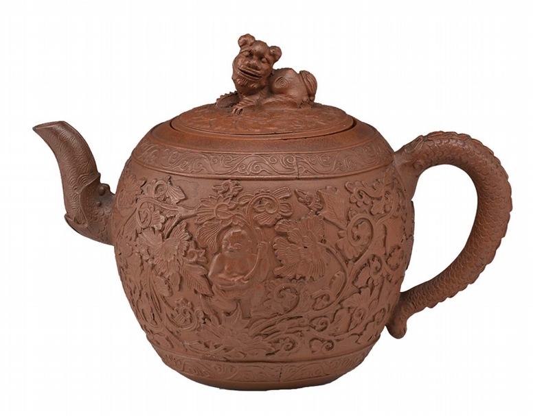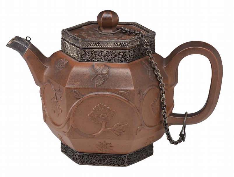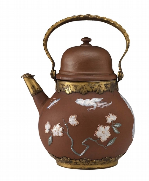 此外,自晚明時期起,江蘇宜興出產的紫砂茶具隨著茶葉的外銷流行於歐洲。早期的外銷紫砂陶器以朱泥為主。宜興的紫砂陶泥特色在於其高可塑性,製作外銷茶壺時壺身常飾以貼花浮雕或吉祥圖案,蓋上或配以獅鈕,大多數紋飾以印模壓製或拍印而成(圖2)。歐洲人更在壺上加添精美的金屬配件(圖3)。當時宜興出產的貼花和透雕圖案紫砂茶壺,更成為歐洲皇室望族的珍藏。