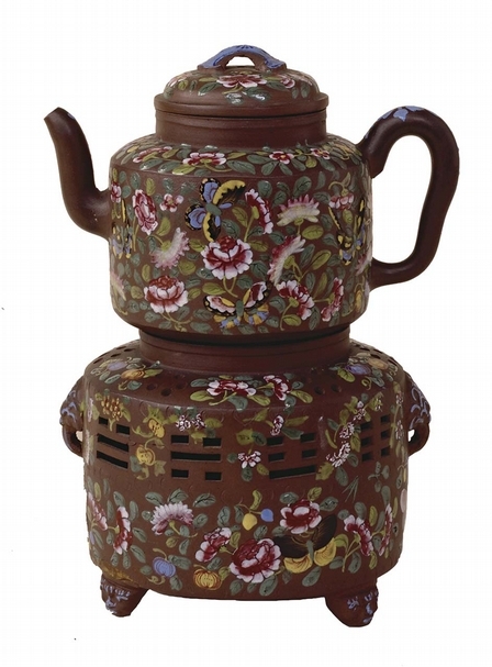 圖4 清/民初(紫砂胎:18世紀晚期至19世紀初期,彩繪:20世紀)〈廣彩直身壺連溫爐〉,茶具文物館羅桂祥藏品。(香港茶具文物館提供)