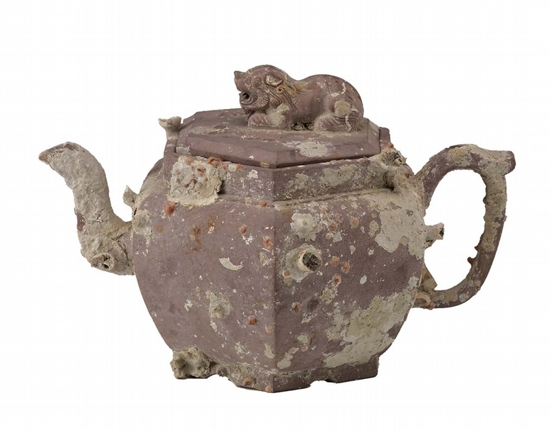 1986年,羅桂祥博士在荷蘭阿姆斯特丹的沉船貨物拍賣中,成功競投得數只紫砂茶壺,並慨贈予香港茶具文物館。該批貨物因曾在南京重新裝船啟運,故於拍賣中被稱為「南京貨物」。貨物中包括一只獸鈕六方壺(圖1),由於可以明確知道生產年代約在18世紀中葉,為研究外銷紫砂器提供了重要的佐證。事實上,自18世紀中葉以來,歐洲國家在貿易廣告和拍賣目錄都稱中國外銷陶瓷為「南京貨物」,意指生產地是中國的南京。這實在是一大謬誤,正確的來源應是江西的景德鎮或江蘇的宜興。
