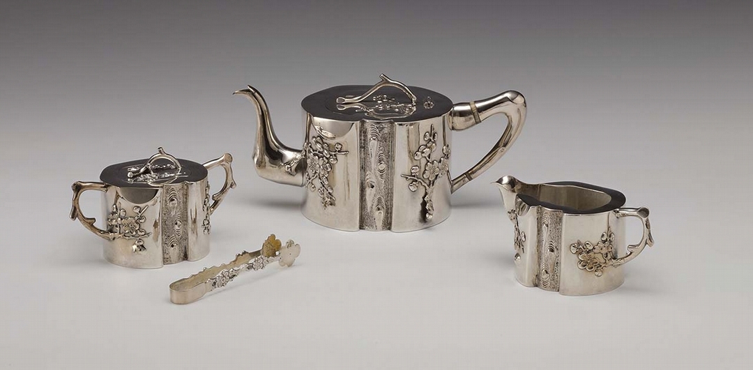 另外,在仿宜興風格的茶具中,還包括茶壺、糖盅、奶壺及夾子(圖11)。壺身、糖盅、奶壺造型仿似梅樁,表面飾以梅花,把手及壺蓋如橫生梅枝。梅花屬傳統中式圖案「四君子」 之一,象徵堅忍和真誠,是中國文人的獨有氣質。茶具底部印有「廣記」、「三記」標記,代表製作這物件的工匠或工作坊。一些較大型商號通常會向外面的工廠和獨立工匠訂購銀器或委託他們打造。每個供應銀器的工廠或獨立工匠,都習慣把其獨有的標記與其他刻字或符號一併刻在銀器上。工廠大都稱為「記」,即細小的店鋪。