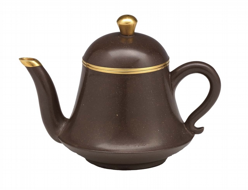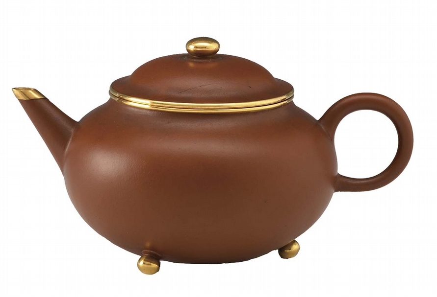 其中鑲金圓壺以紅泥製成,球形的壺身由三隻圓腳支撐。細小壺流的最高點、壺把及壺口成一水準,具備了典型功工夫茶壺的特色。壺鈕、壺蓋的邊、壺咀的尖端、壺口及圈足都鑲金,以保護器皿脆弱的部分及增添高貴的裝飾效果。壺的邊沿及壺底分別有「125」及「泰國」泰文的印記,代表這個茶壺是泰皇拉瑪五世於清光緒年間委託工匠製作的,為皇室御用茶壺。