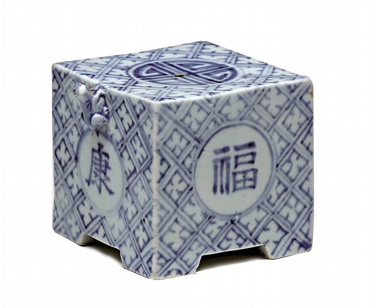 此為南宋時期龍泉窯青瓷,釉色上呈現出以多層掛釉的粉青色,在日本多稱之為「砧青磁」。鎌倉、室町時代開始,龍泉青瓷即作為貿易品而盛行於日本各地。這種雙耳為鳳凰造型的「鳳凰耳花生」在砧青磁中更屬珍貴,和泉市久保惣記念美術館藏日本國寶〈萬聲〉及陽明文庫藏日本重要文化財〈千聲〉等皆為傳世名品。此件作品擁有突出的釉色及造型比例,對比前述兩件傳世品可說是有過之而無不及。此作傳為丹波篠山藩青山家舊藏。