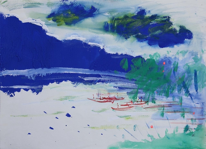 如何巧妙的用筆與色,用筆色在西畫的水彩裏,找到自己並且突破在輕與重的變化裏去發現與創新,因有法無法相通及娛樂性中畫的用筆和西畫的用色是二絕,能綜合在一起是新水彩畫,用筆即用色,用色即用筆,在畫不離對筆色的高下,對顏色的看法和經驗,留法期間看到用色的開放,影響到我的創作;但有敗筆不易改,亦是失敗的作品,故中畫對我亦有影響力,故對筆色的用法持之以恆的發現創新與維持,畫的過程即判斷選擇與完成,故我的畫出自中西化與個人化,簡筆不失基礎為要,看西畫更了解本國文化而融合西方的色彩於少色內,中國人用筆很精,象徵善少色,至於西方也強化用色,偶趨於抒情,又人活於速度中筆色難分,2017-17融合西方象徵主義等及東方山水畫的精神,2014創單少色的畫,創景,以水彩繪出油畫的色彩,再現中西風華。