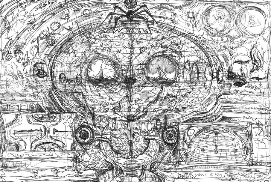 回看陳敬元早期作品,多半以電腦工序這般不留筆觸、帶有距離、相對於身體更為失溫的方式創作,作品關注於人心的擺盪與現實政治之間;而從2013年的「flare-s」個展開始,他開始持續以小幅油畫的方式,藉由古典的創作手勢逼近自己的心、腦與意識。這批看似恍惚如夢卻又帶有真實疼痛感的小畫系列,開始浮現出某種欲切趨近真實的筆觸與構圖,奠定了他此後主要的繪畫風格;同時,他也以科學、哲學、星象、神秘學等角度,對人所處在的世界探問何謂「真實」。此次在「船上的蜘蛛」中展出的素描作品《Sketch no.8》,某種程度上像是一幅描繪真實世界的宇宙模型,另一方面亦是創作者自我的內在投影:兩個由內往外望出的孔洞、個體外部的世界環繞於象徵大腦的圓弧體周邊,而位於畫面上方的蜘蛛,則像是擷取資訊者,在各種事物的連結之中找尋自己的座標。「我覺得我的創作像是在我內在感受中上演的電影,我只是把腦中那些影像、某種片段畫出來,而框對我而言就是取景、把東西確立下來的元素。」在此次展出作品中,可以看到幾幅狀似沒入牆面的畫作,材料來自駐村期間,陳敬元在當地市場中購得幾幅古老的作品,將畫框、畫布拆下重製為作品的一部分,將自身感受的切片以繪畫方式延伸到這些具有時間性的老物件上,顏料一如意識的攀爬,也像是這些直覺感受終於在創作過程中長出的血肉,成為另一種身體性的現實附著。「在我畫面上的一些皮毛、皺摺、被揭開的東西是時間的狀態,我覺得人就像是被印在上面的圖案,因為一些看不見的外力將我們拉扯、聚集在一起,在某些狀態下我們無法意識到整體性,但是我們都是在同一平面上。那種真實感不是每個人的,只有對你自己而言才是,只有自己感受到的東西才會如此具體。」陳敬元說。